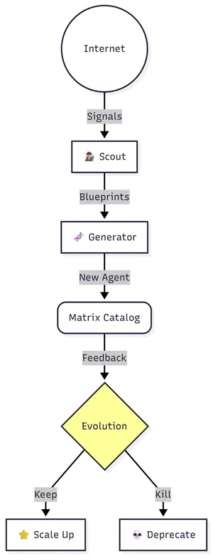 It then deploys this new agent to the Staging Area. By the time a human scientist thinks, “I wonder if there’s an AI tool for Quantum Chemistry,” the Matrix has already birthed one, tested it, and indexed it. The system anticipates our needs, growing its own capabilities in response to the shifting landscape of global software development.