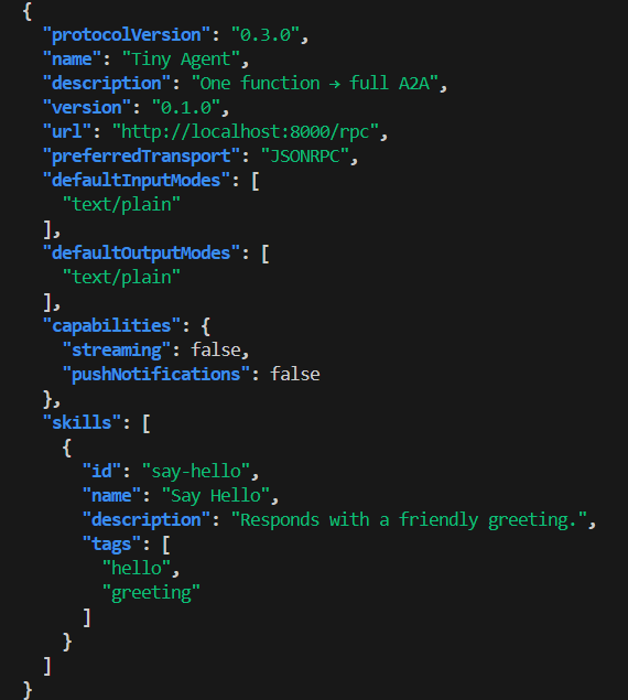The Agent Card lets clients auto-discover how to talk to the agent — no hardcoded assumptions. Messages can carry typed parts (text, files, data) with MIME types, so you can do more than just plain strings. And when you want richer UX, A2A supports task/status/artifact events and streaming, which means you can build experiences that feel alive instead of just returning a blob at the end. On top of that, JSON-RPC gives you predictable errors and request IDs, which makes production debugging much less painful.